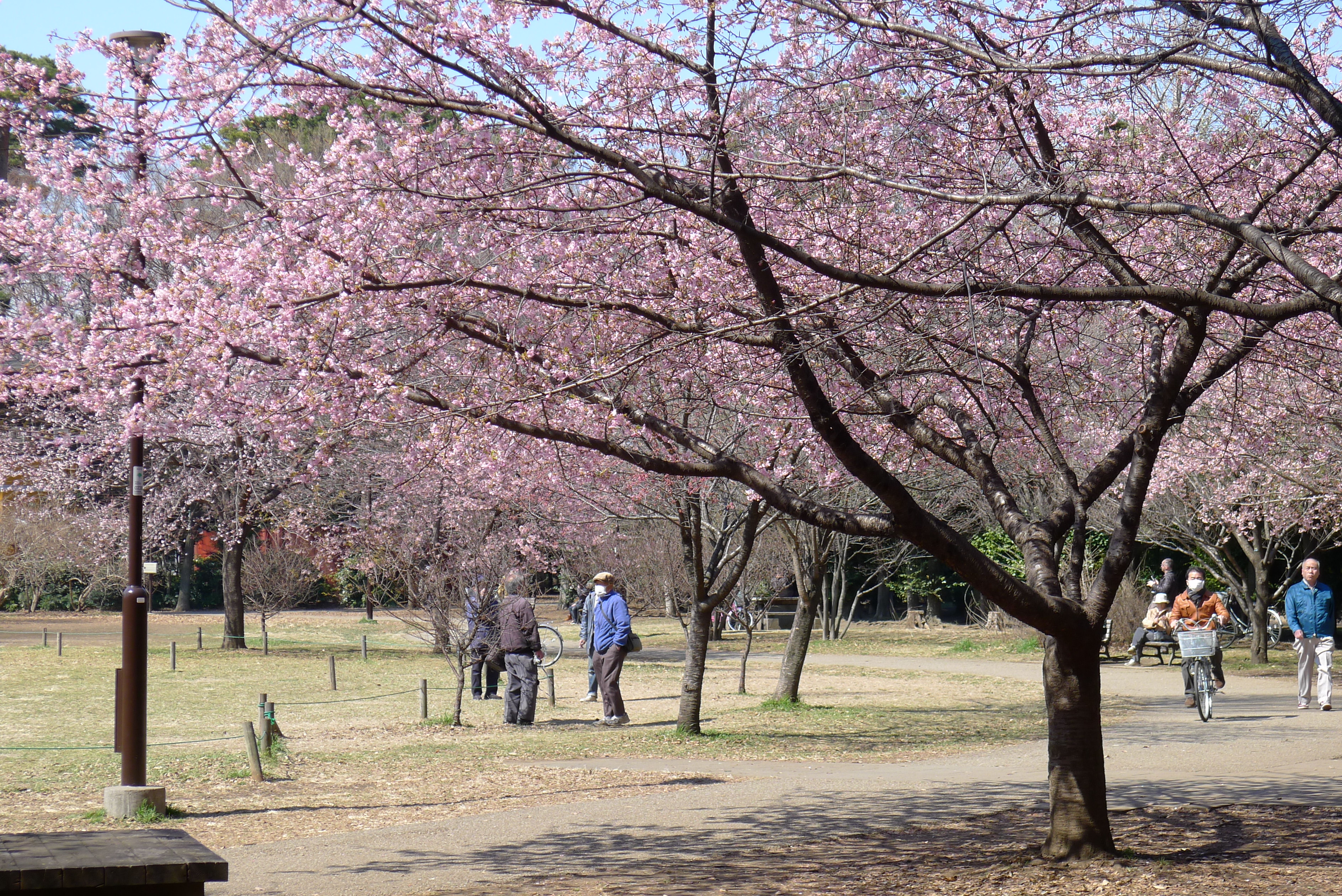 目前還不到櫻花的季節, 所以櫻花樹都是光禿禿的, 只有零星幾株提早開花了